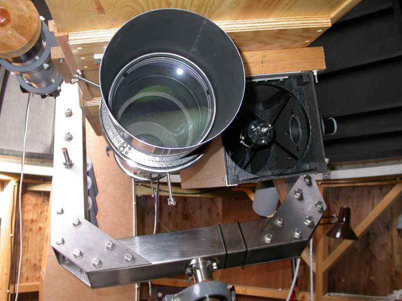 Efter længere tids overvejning besluttede jeg at bygge min prototype 6" F5 Newton om. Optikken var i orden, men den mekaniske stivhed af tubus, og nemheden i brugen af udtrækket lod en del tilbage at ønske. Her ses den gamle 6 tommer Newton ved siden af mit 6 tommer guideteleskop. Udtrækket på Newton'en er et helikalt udtræk med en stigning på 1 mm per omgang. Fokusering er temmeligt omstændeligt, og manuelt. Der kan ikke anvendes en coma-korrektor.