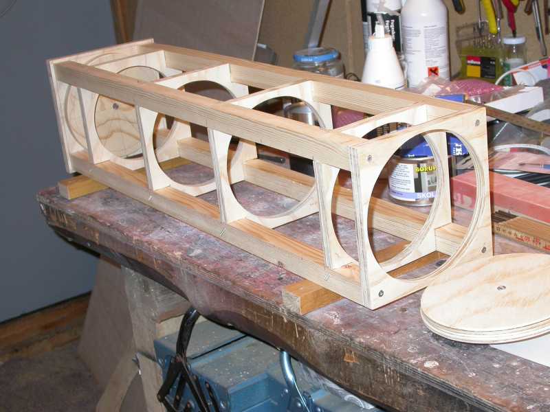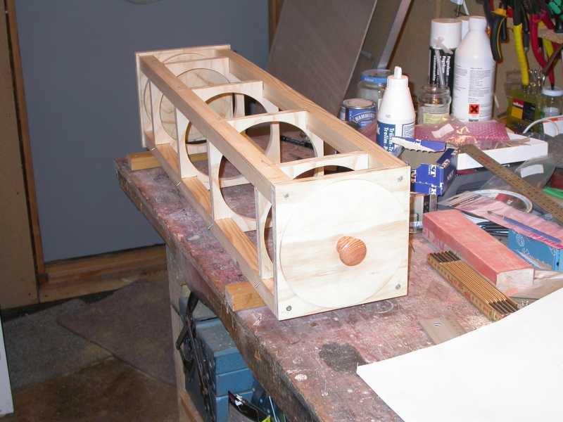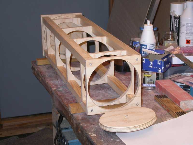 Nu skal stifterne der har holdt bafflerne på plads mens limen hærdede, klippes af og dykkes. Dernæst skal spejlcellen gøres færdig og monteres. På billederne sidder den runde skive der skal anvendes allerede i bunden af tubus. Som beklædning anvendes 4 mm birkefiner, som jeg har fået som rest fra et kuppelprojekt. Alt indvendigt males med skoletavlelak.