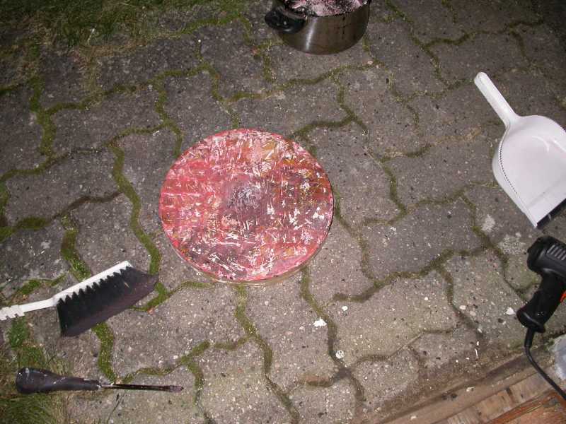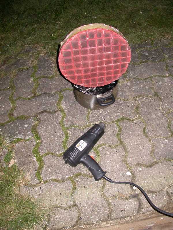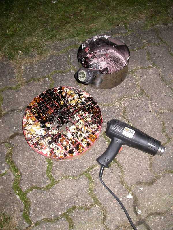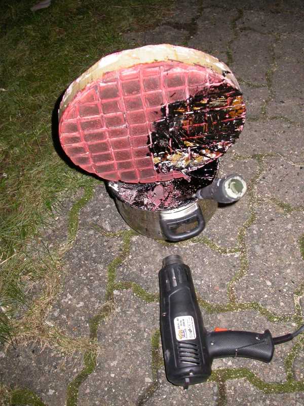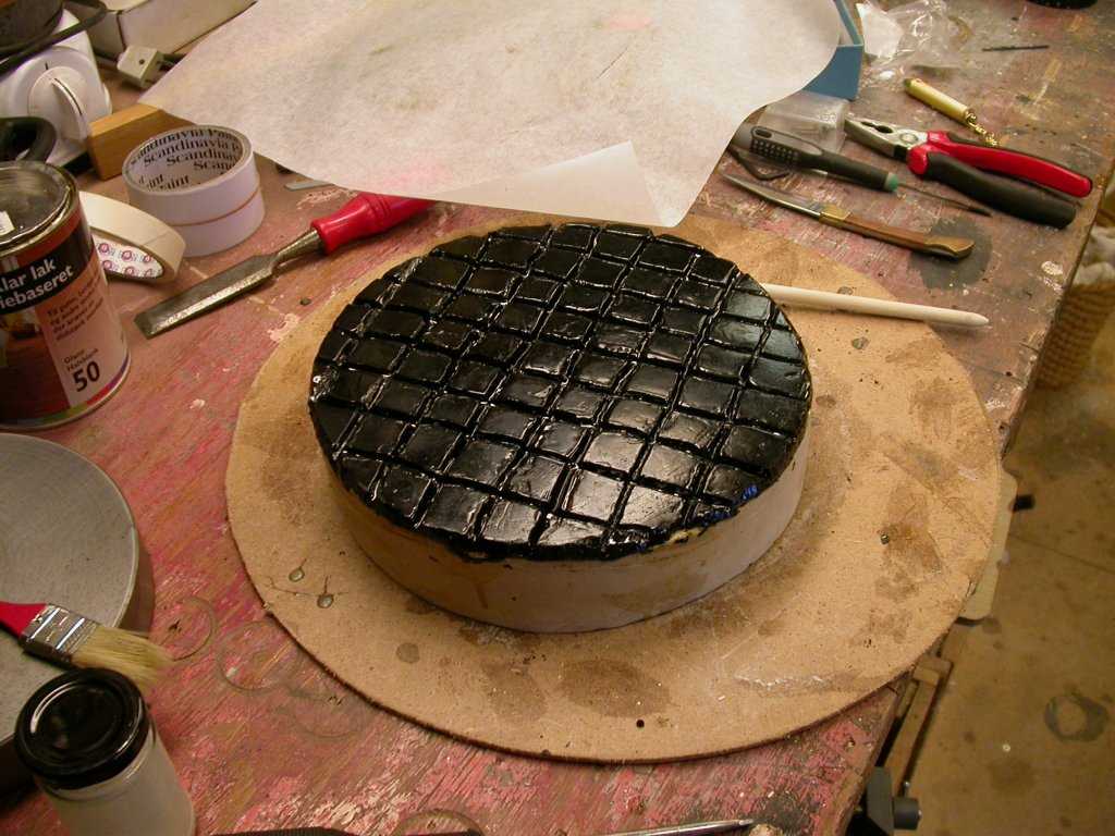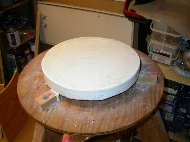 Gipsunderlaget var støbt i facon som det grovslebne 12" glaslegeme, og i ret god stand, så det besluttede jeg at genbruge. Men den gamle beg skulle af. Det blev klaret med en varmluftblæser.